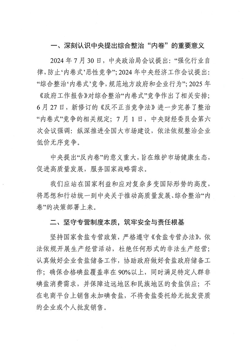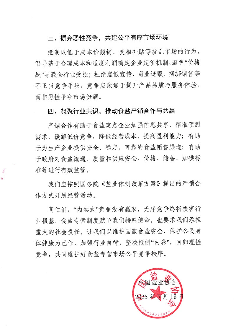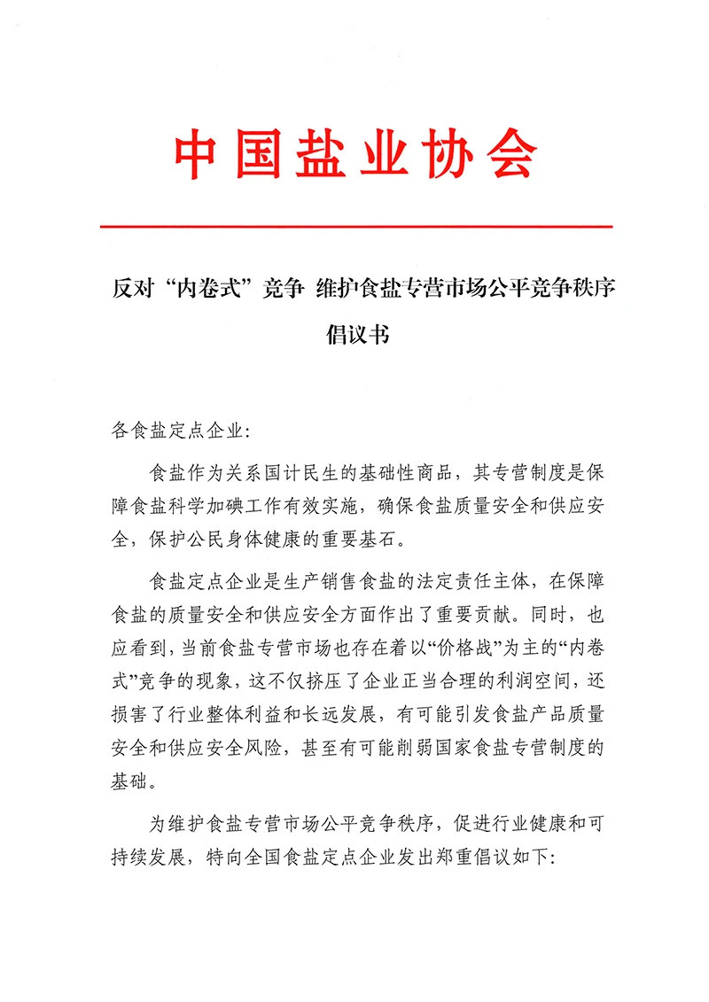 中国776net必赢协会发布《反对“内卷式”竞争 维护食盐专营市场公平竞争秩序倡议书》